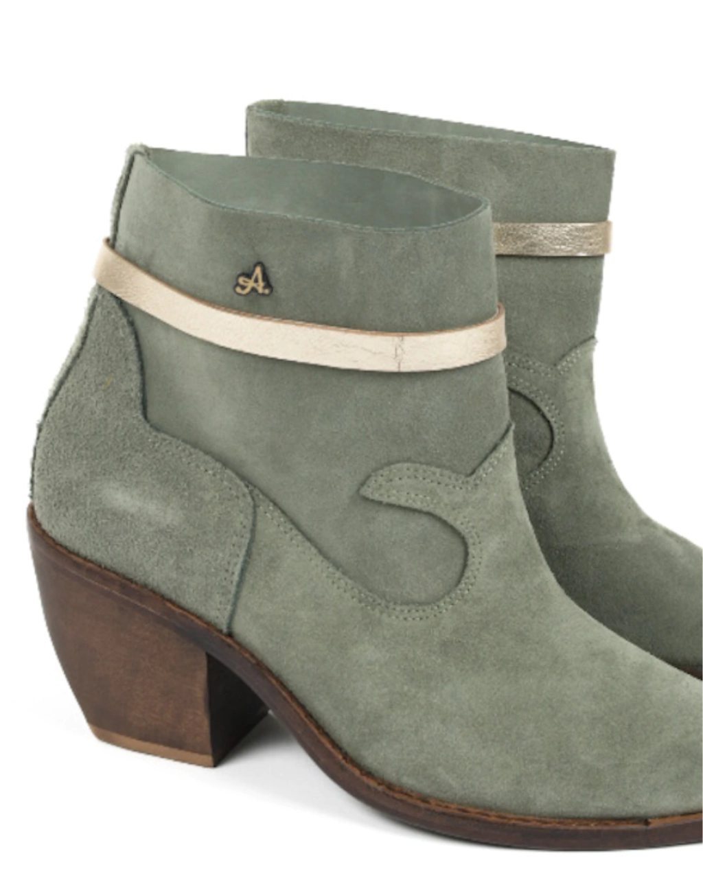 Bota confeccionada en gamuzón con suela y taco de madera artesanal. Su capellada presenta un diseño orgánico y fluido que aporta carácter sin perder suavidad.