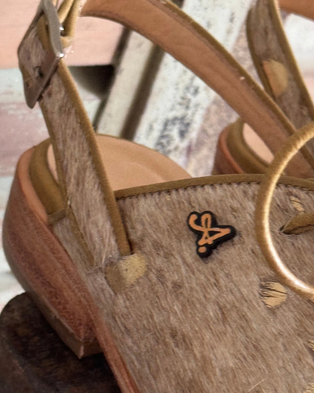 Flippie Oro está confeccionado íntegramente en cuero pelo con detalles de metal oro.