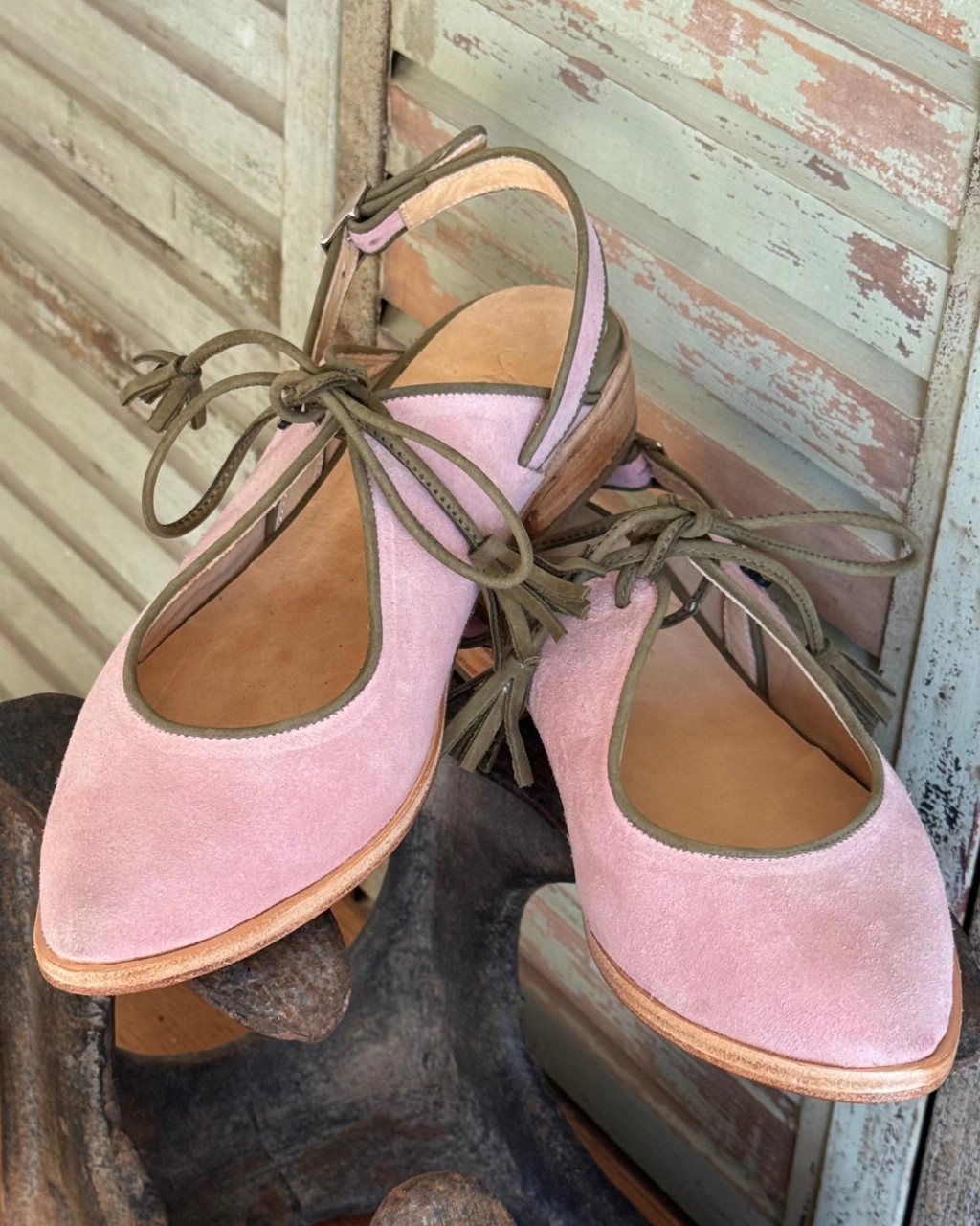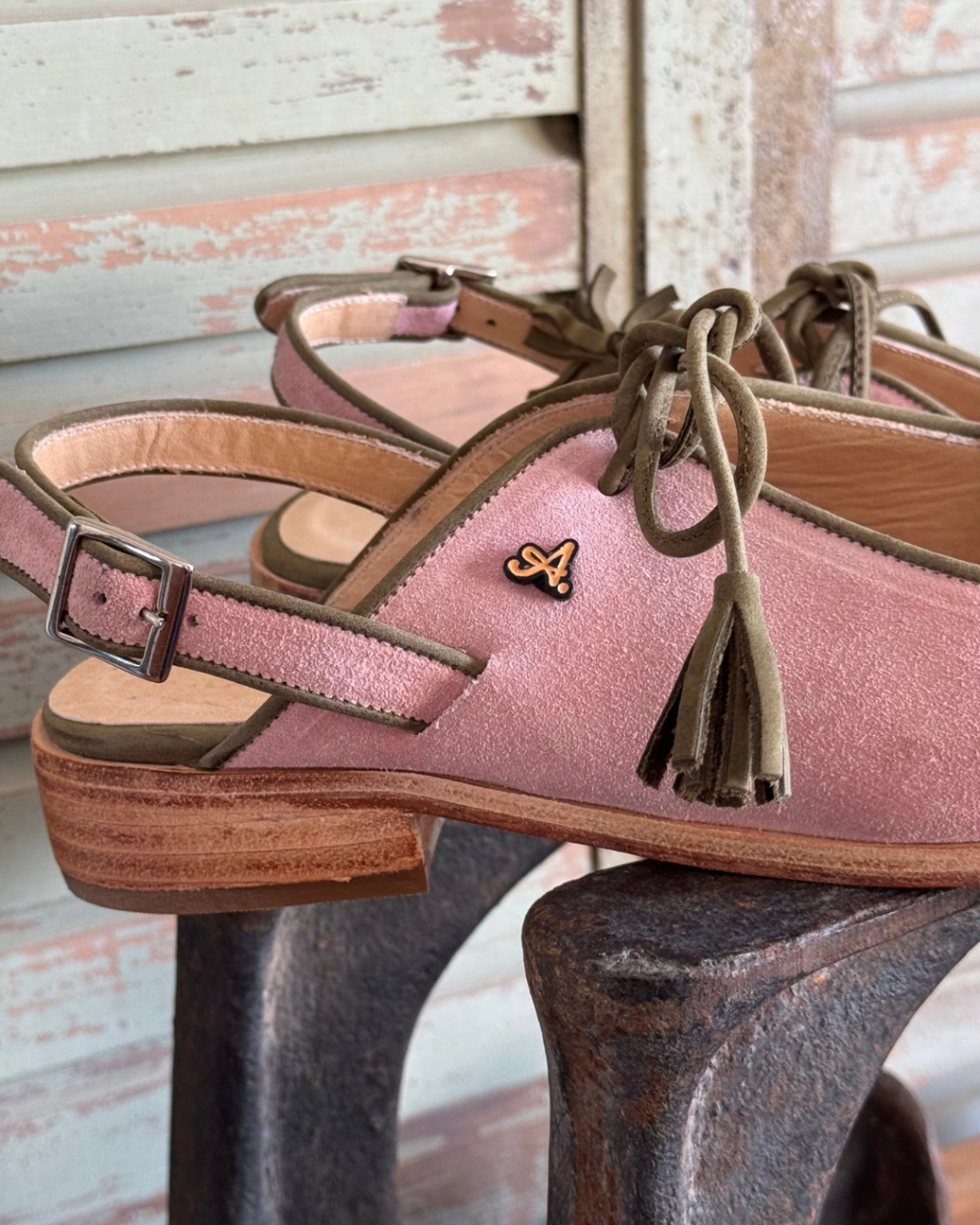 Flippie Roseta está confeccionado íntegramente en gamuza rosa. Ribete y cordon en cuero verde.