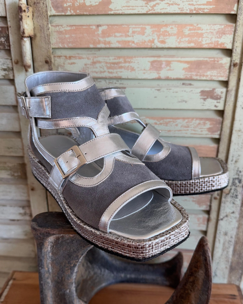 La sandalia New Ann Plata es la elección perfecta para quienes buscan un toque de elegancia y comodidad en su calzado. Este modelo destaca por su diseño romano asimétrico, confeccionado en gamuzón gris que aporta un aire sofisticado.