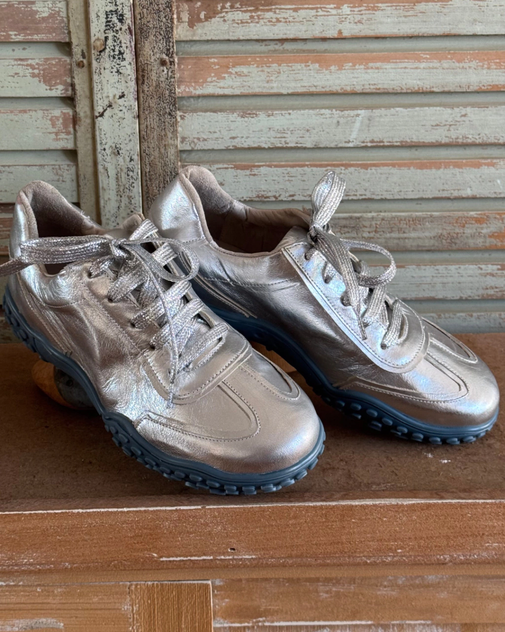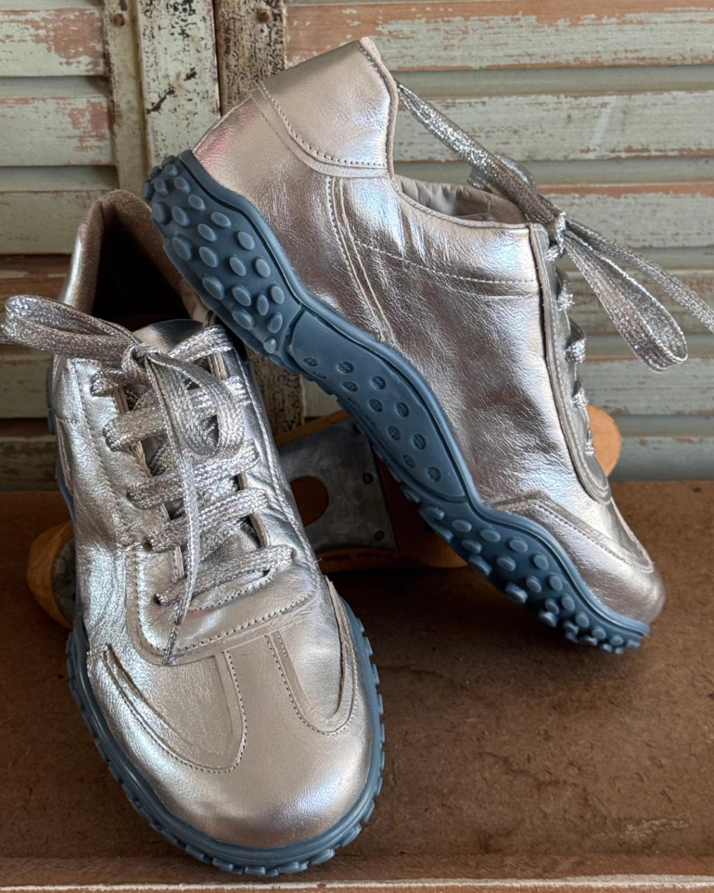 La Sneakers Elsa están confeccionadas integramente en cuero. Total Plata ha sido el color elegido para combinar con esta nueva base. Toda la forreria es en cuero lo que deja respirar el pie y es un placer llevarlas sin medias.